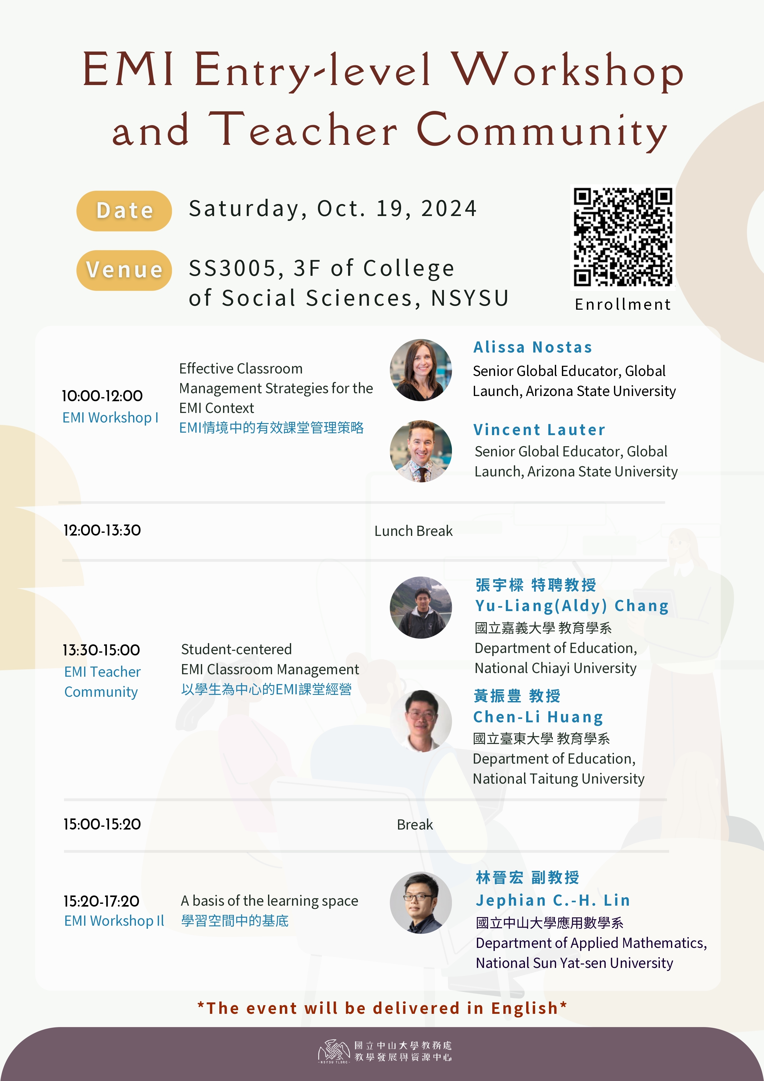 (三)主題:EMI情境中的有效課堂管理策略、以學生為中心的 EMI課堂經營及學習空間中的基底,活動將以英文進 行。