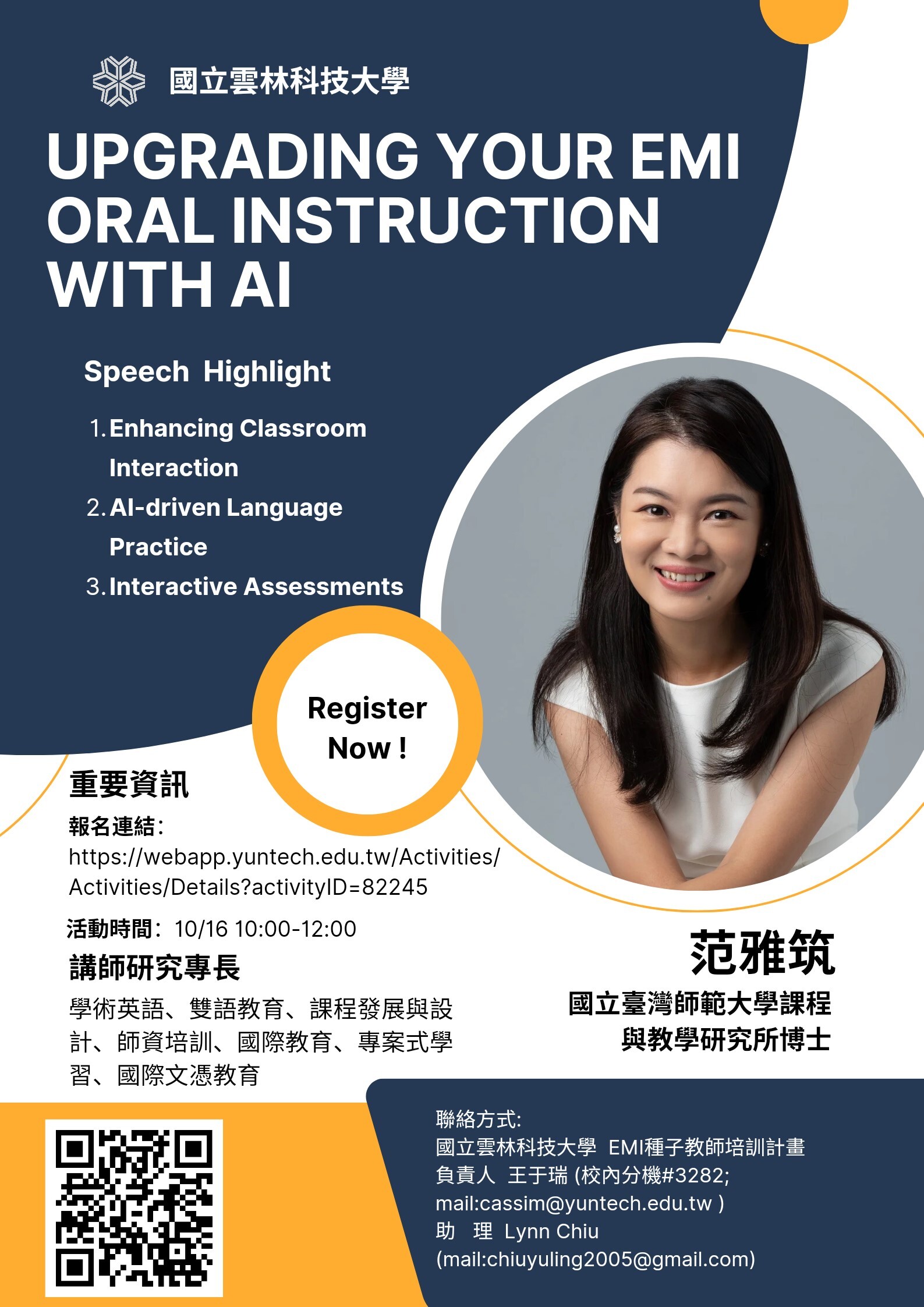 二、講者:國立臺灣師範大學EMI教學資源中心范副執行長雅 筑。