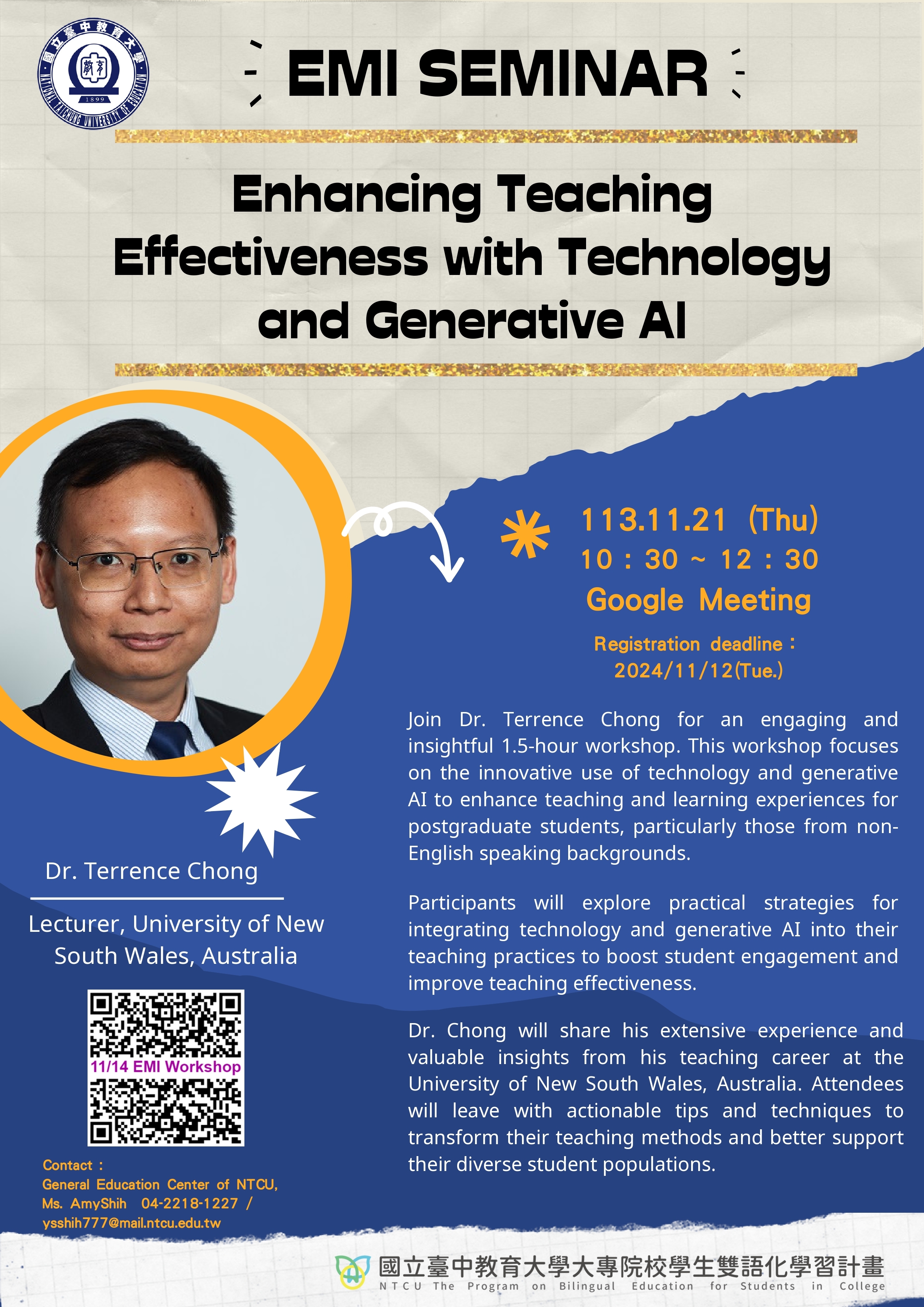 一、本校通識教育中心辦理「EMI 專題研討會」,邀請專家學 者分享將生成式人工智慧(AI)融入教學實踐的實用策略, 以提供學生的參與度並提供教學效率,有助於提升教師教 授EMI課程之助益及成效。