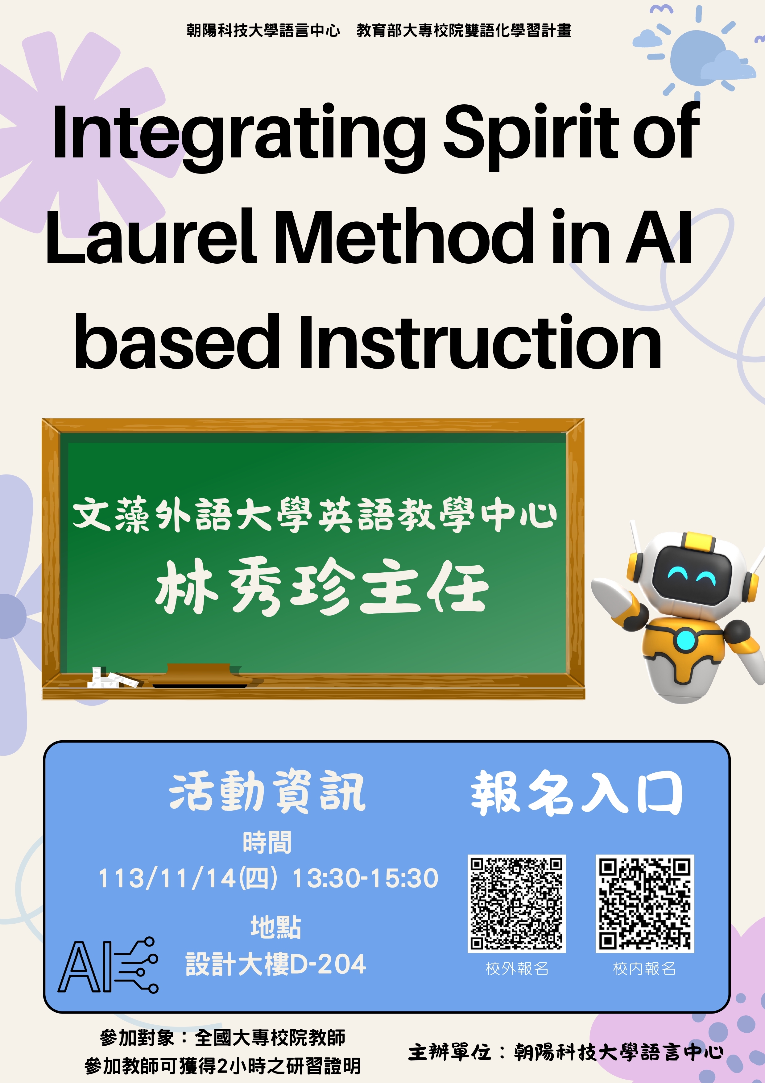 【通識教育中心】轉知:朝陽科技大學校訂於113年11月14日(星期四)辦理EMI教師英語研習 工作坊-「Integrating Spirit of Laurel Method in AI-based Instruction」