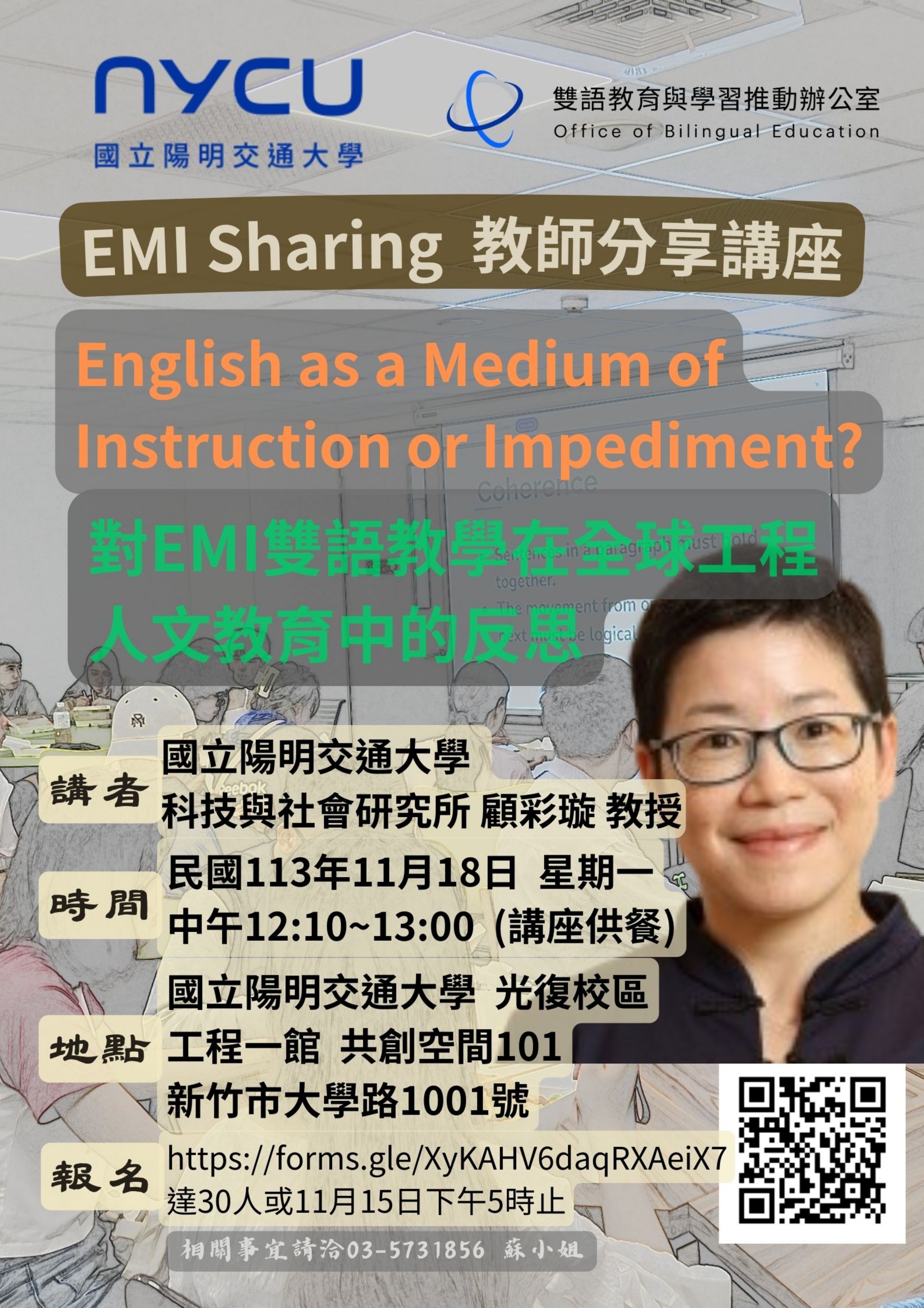 【通識教育中心】轉知:國立陽明交通大學校雙語教育與學習推動辦理EMI教師分享會,講題:「English as a Medium of Instruction or Impediment? 對EMI雙語教學在全球工程人文教育中的反 思」