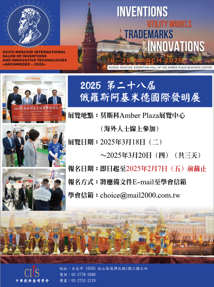 主旨:2025 第二十八屆 俄羅斯阿基米德國際發明展