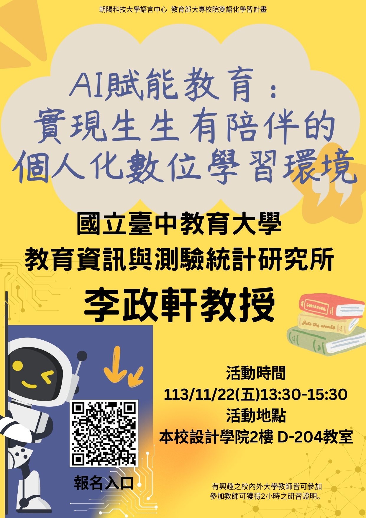 【通識教育中心】轉知:朝陽科技大學辦理EMI教師英語研習 工作坊-「AI賦能教育:實現生生有陪伴的個人化數位學 習環境」