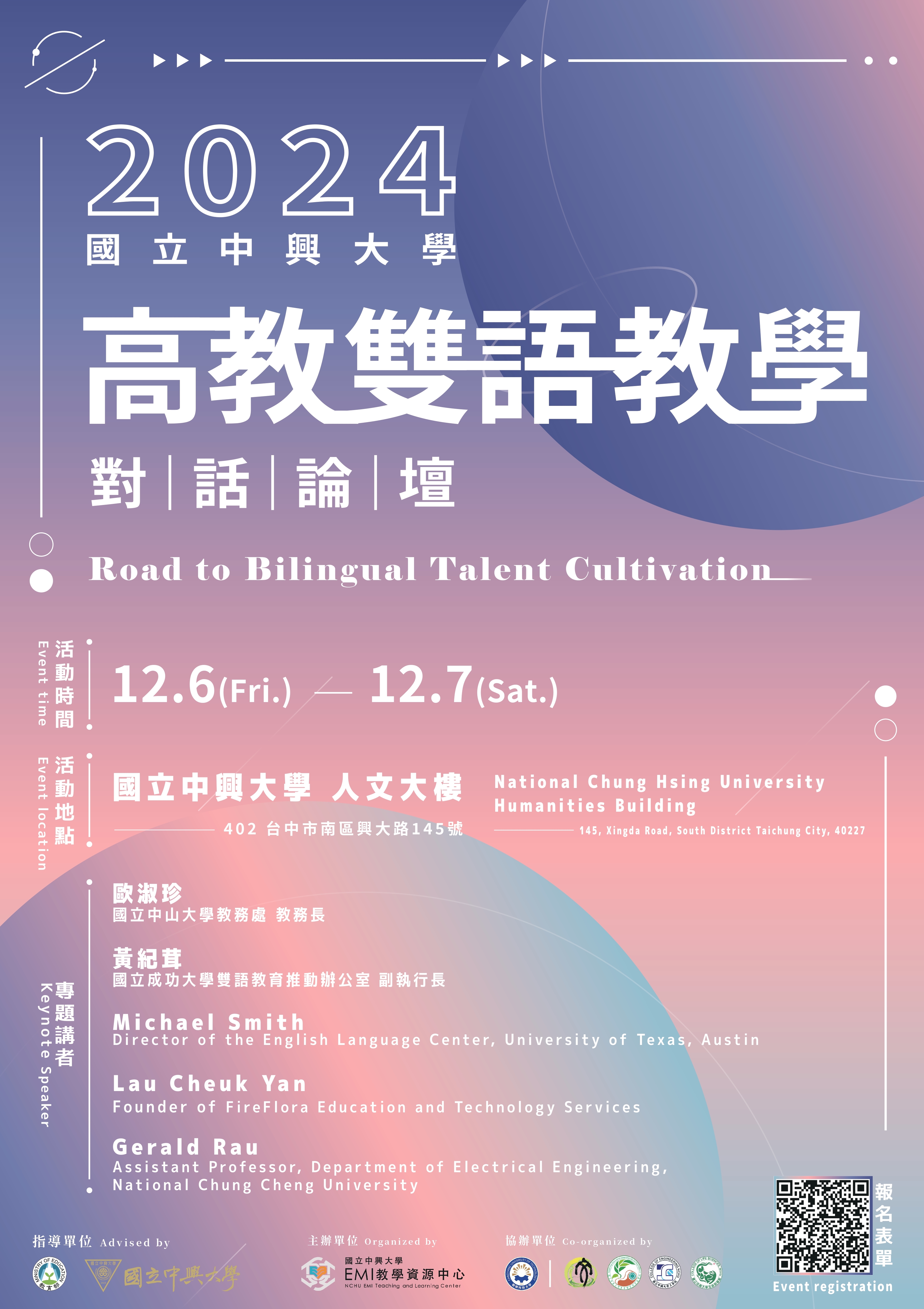 主旨:有關本校EMI教學資源中心辦理「2024 國立中興大學高教雙語教學對話論壇: Road to Bilingual TalentCultivation」,請惠予轉知並鼓勵貴校教師踴躍參加,請查照。