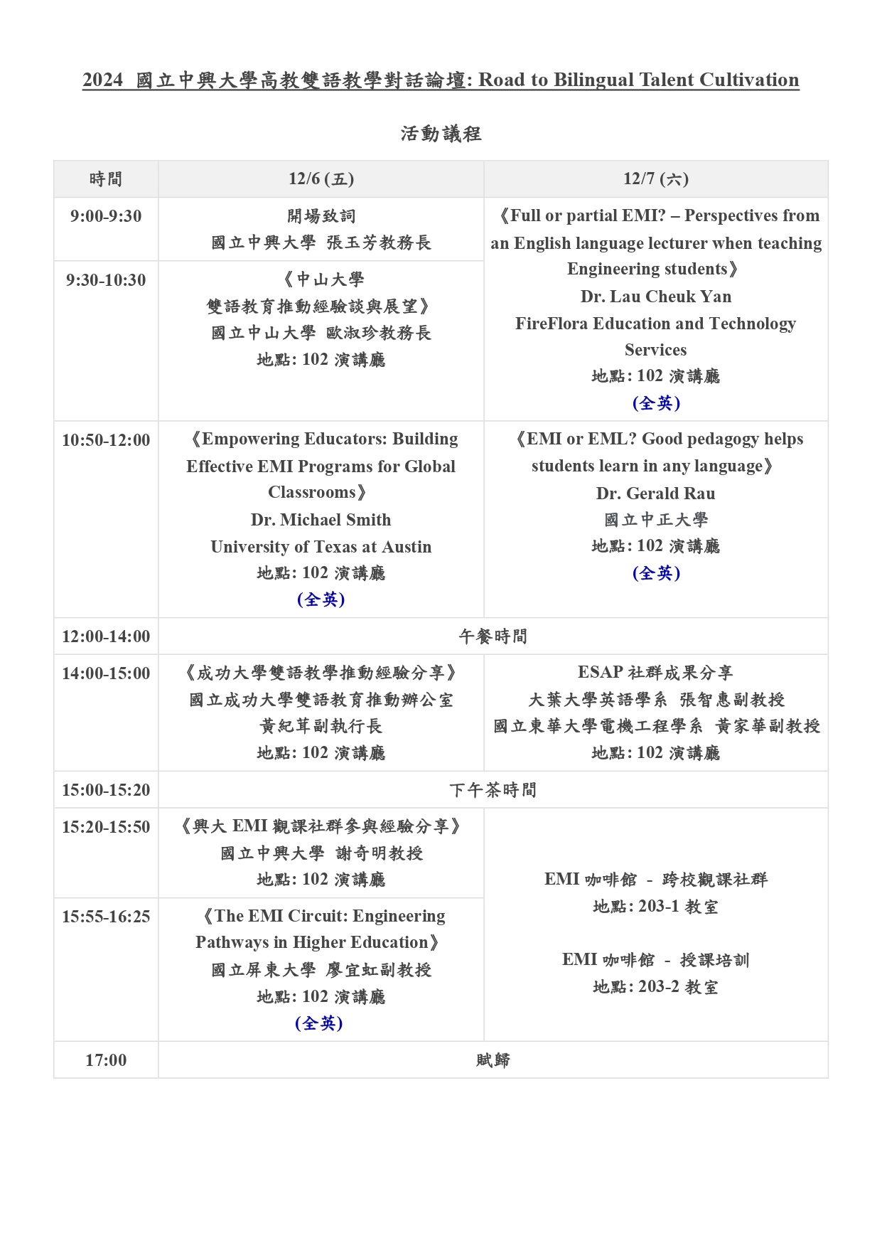 一、為推動我國2030雙語政策,本校自113年起執行「國立中興大學EMI 教學資源中心計畫」,以深化雙語師資專業發展、共享雙語教育資源,並辦理旨揭活動,期藉由交流過程及探索,提升雙語教學的質與量。