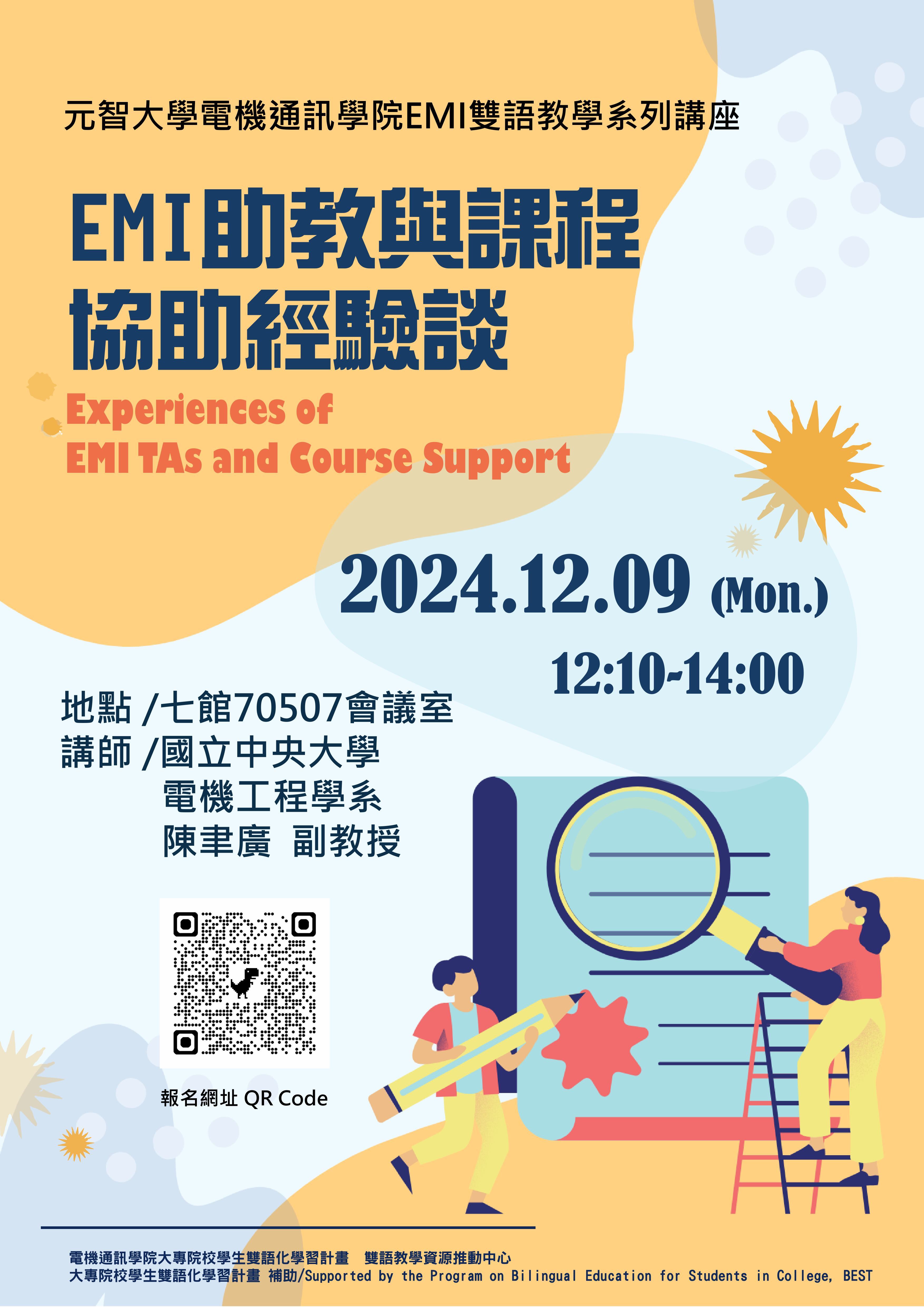 一、為增進EMI課程教學技巧,並提升教師EMI教學能力,本校 電機通訊學院於113學年度第1學期辦理「EMI雙語教學系列 講座」,歡迎各大專校院教師報名參與。