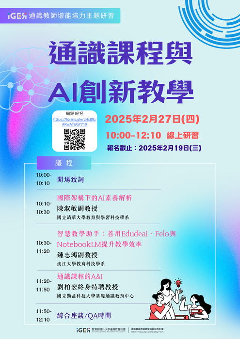 【通識教育中心】國立清華大學有關教育部提升大學通識教育中程計畫-分項2辦理「通識課程與AI創新教學線上研習」,敬請貴校教師報名參加, 請查照。