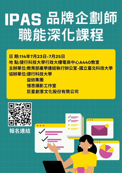 【通識教育中心】轉知:檢送國立臺北科技大學與健行科技大學合作辦理「iPAS品牌企劃師職能深化課程」課程資訊(詳如說明),敬邀貴校在學學生踴躍報名參加,並請協助公告,請查照。