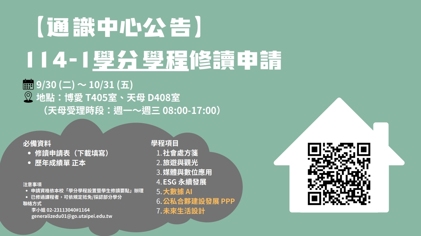 【都市研究院】【114-1通識主責7項學分學程】114/9/30(二)~10/31(五) -每學期第4-8週,開放學生提出申請